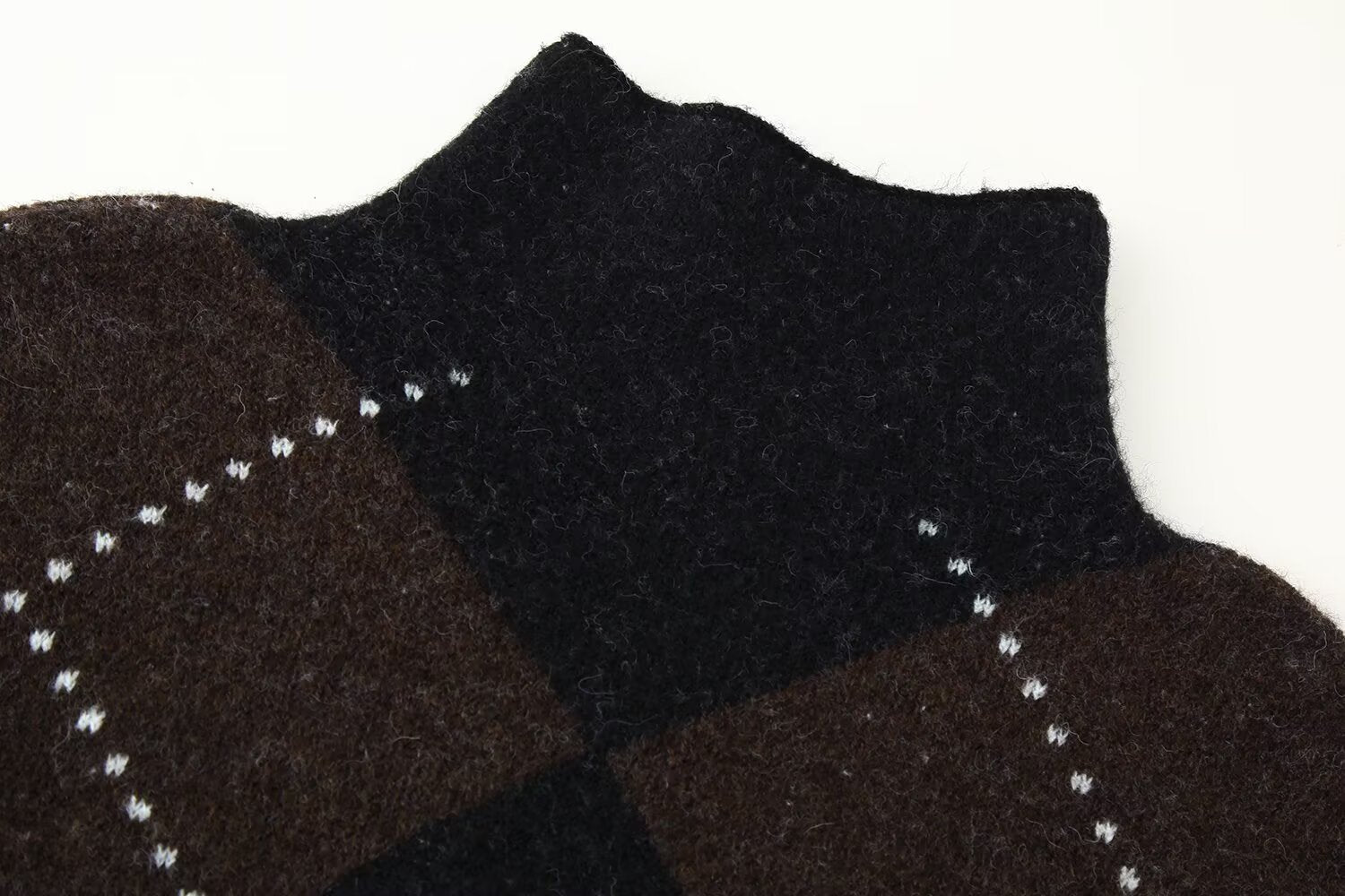 A two-piece set featuring a long-sleeved diamond plaid pullover knit top paired with a coordinating skirt. The high-neck design and intricate geometric pattern deliver timeless appearance.