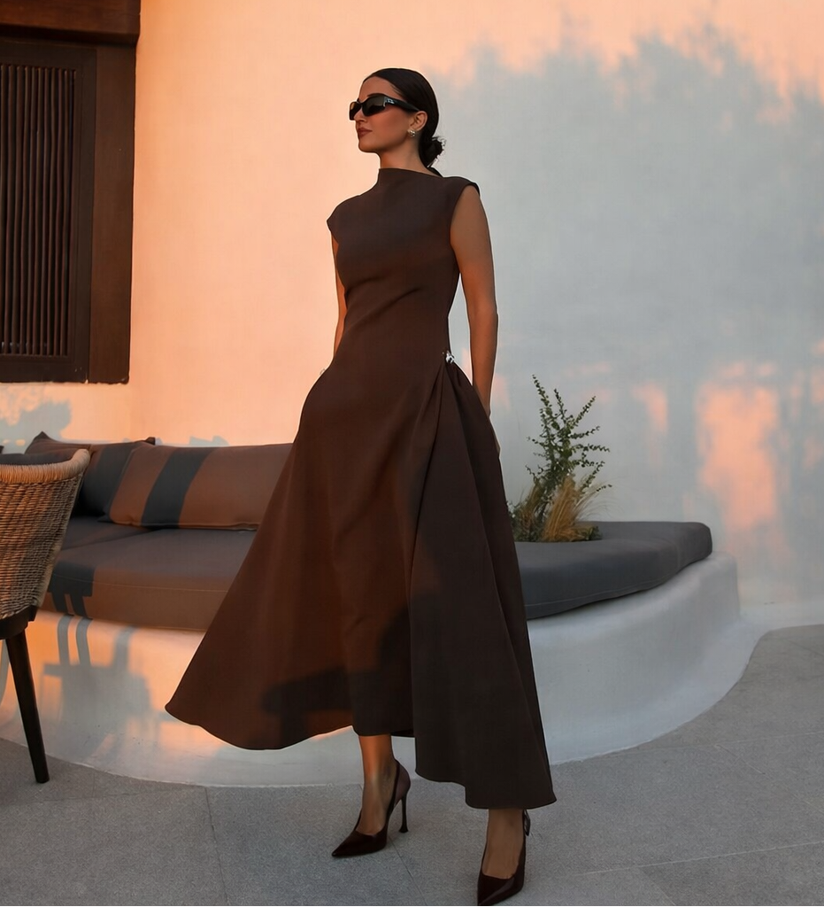 This sleeveless dress combines sophisticated elegance with everyday versatility. Crafted from premium polyester, it features a crew neckline and a streamlined silhouette that flatters the mid-rise waist. Available in classic black and rich reddish-brown, the solid design transitions seamlessly from casual outings to social occasions.
