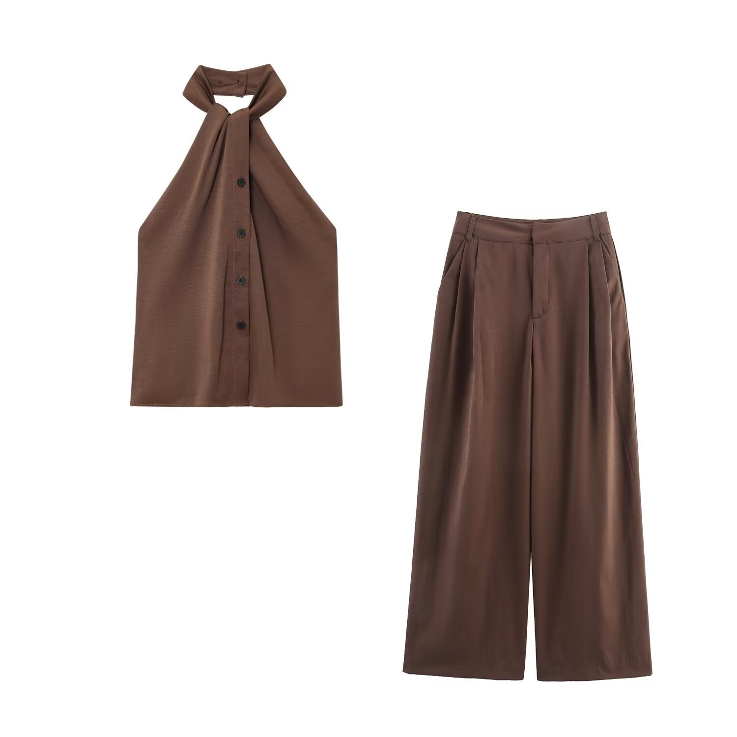 A sophisticated two-piece set, featuring a sleeveless halter neck top paired with tailored pleated pants. Crafted from premium polyester blend, this ensemble delivers a polished European aesthetic with effortless comfort.