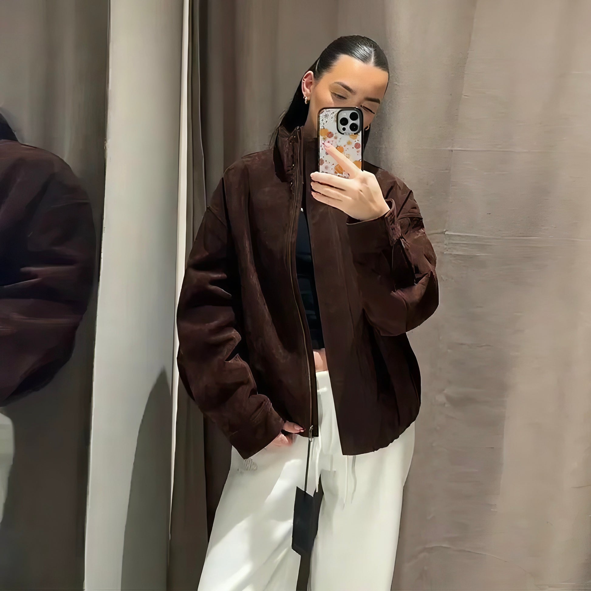 Elevate your fall wardrobe with this sophisticated suede leather jacket. Crafted from premium polyester with a no-wrinkle finish, this loose-fitting piece features a distinctive stand-up collar and full-length zipper for effortless styling.