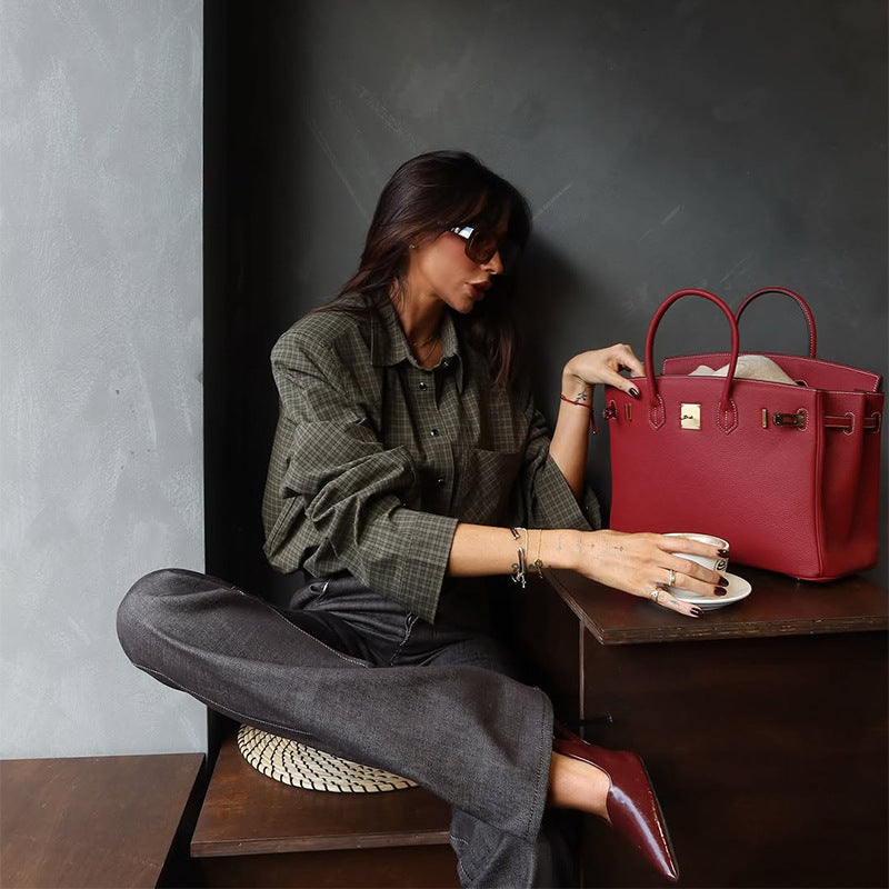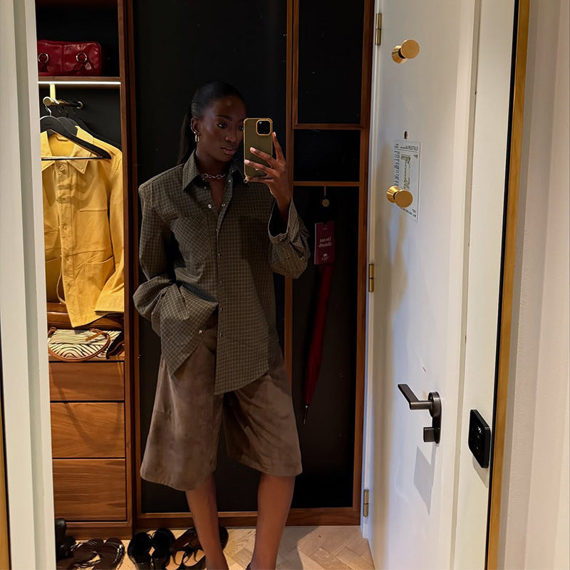 Elevate your autumn wardrobe with this sophisticated plaid cardigan shirt, crafted from premium polyester for durability and comfort. Featuring a refined lapel collar, single-breasted button placket, and elegant lock detailing, this piece seamlessly transitions from office to casual settings. The regular-fit silhouette with long sleeves offers versatile styling options, while the classic plaid pattern adds timeless appeal.